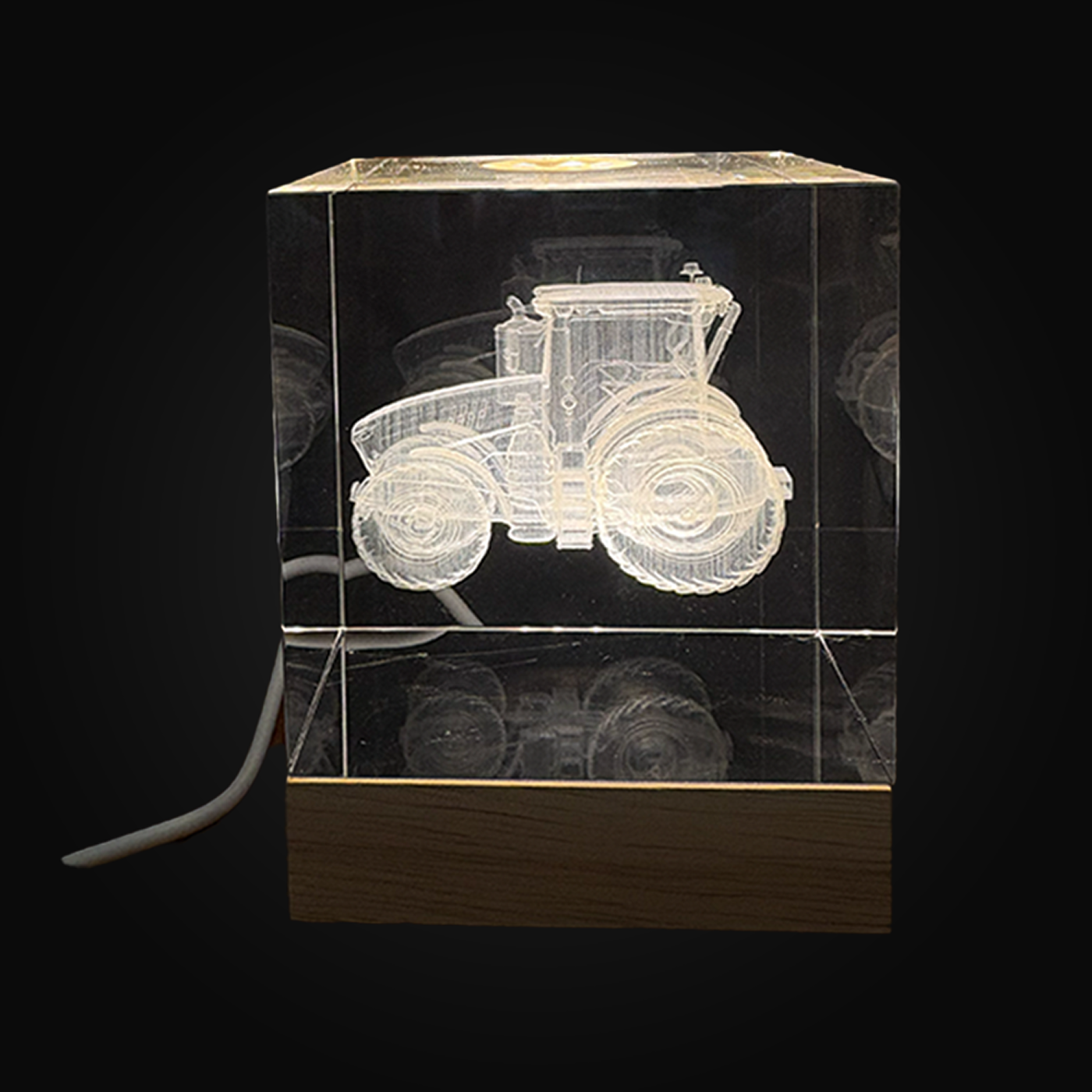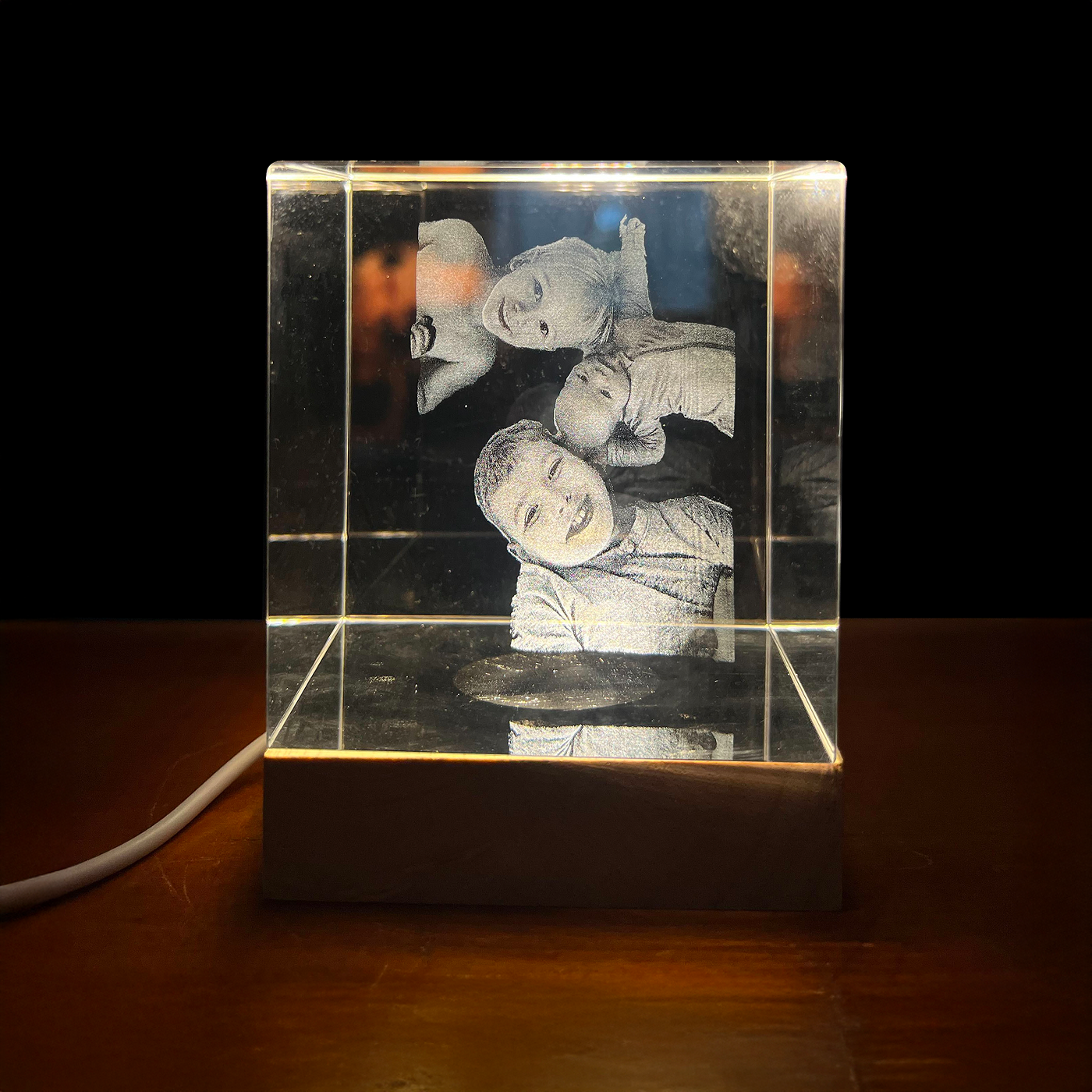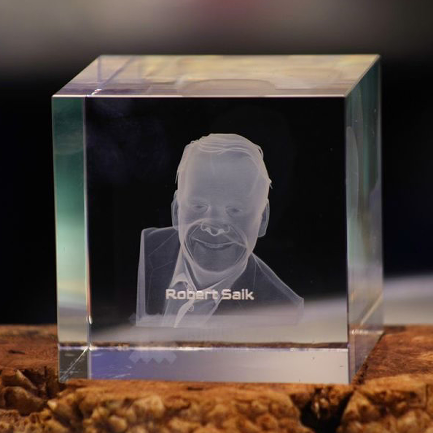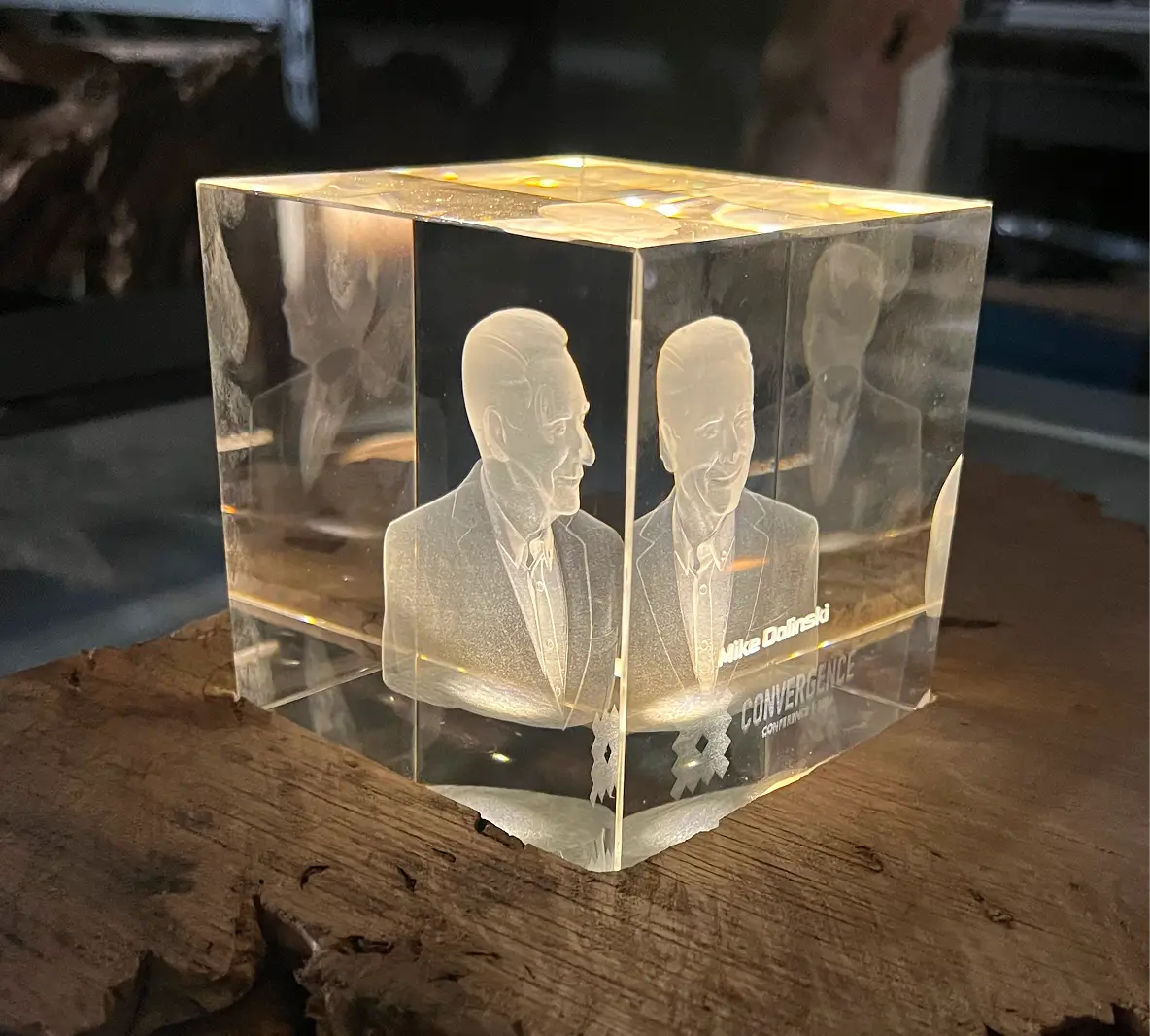 This limited edition piece is crafted as a 3D crystal cube, bottom-lit, resting on a hand-finished burl wood base.