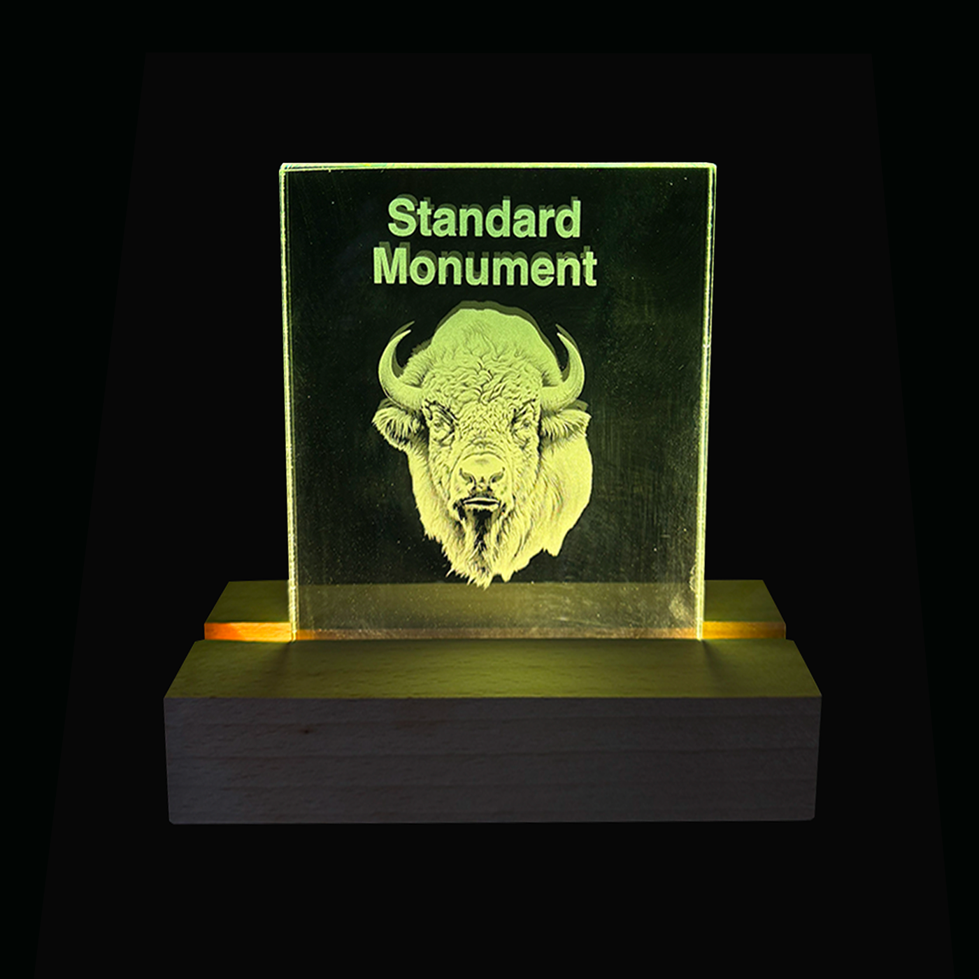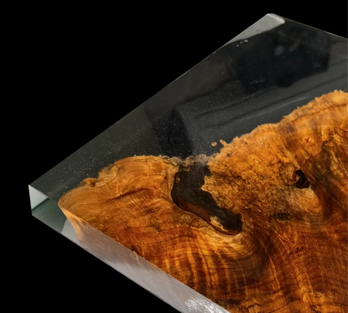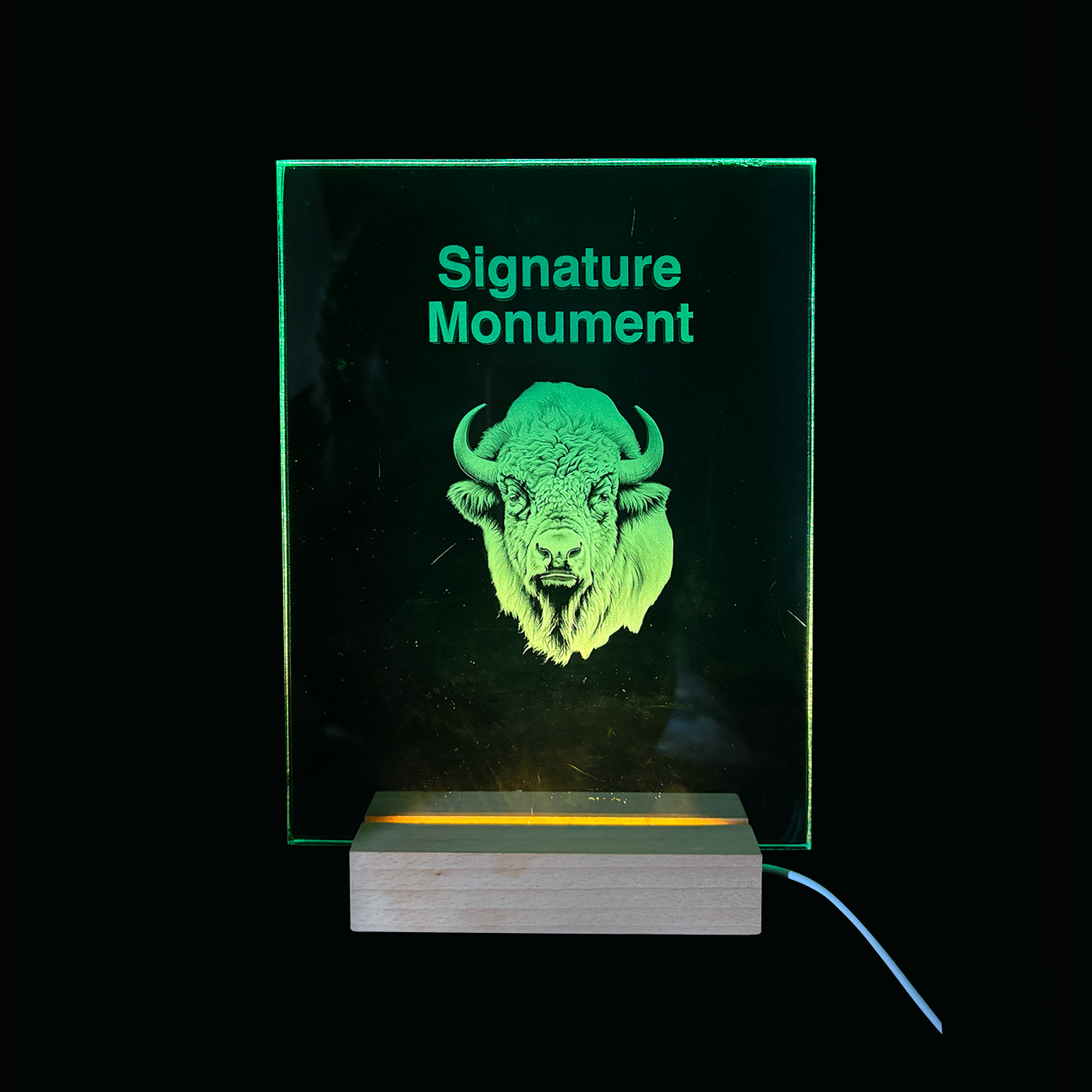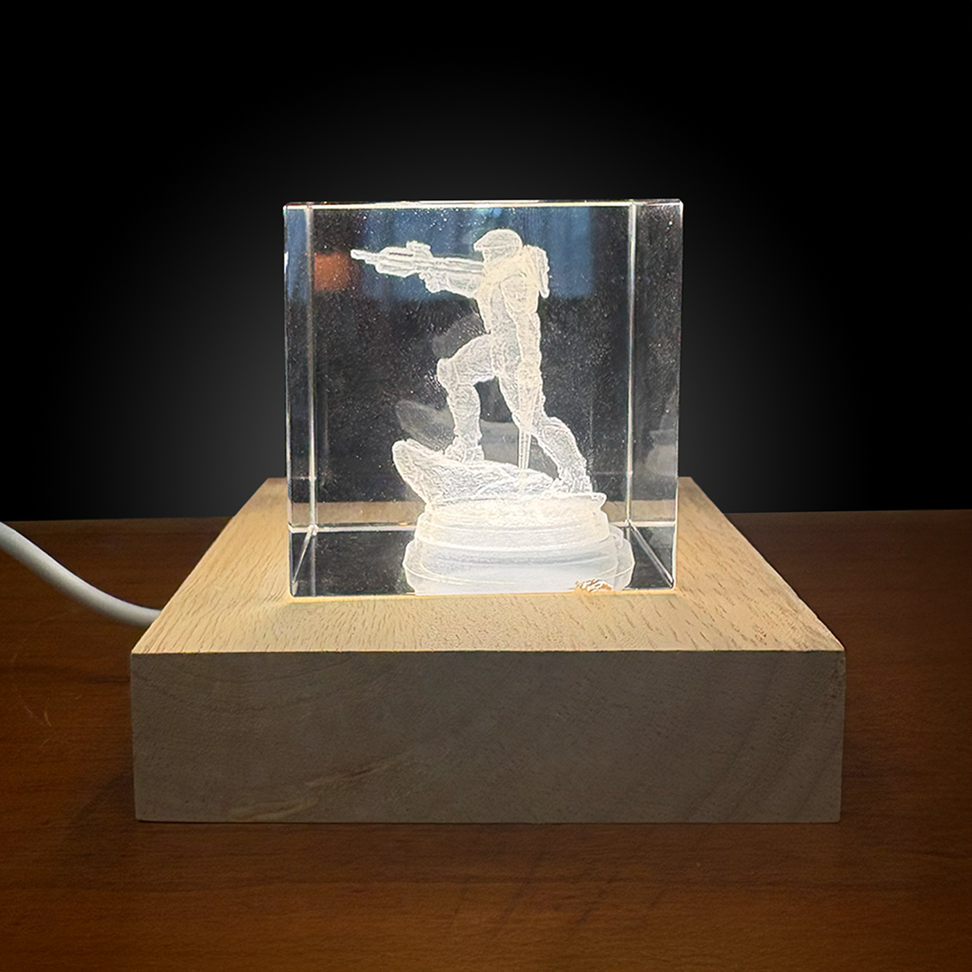 This limited edition piece is crafted as a 3D crystal cube, bottom-lit, resting on a hand-finished burl wood base.